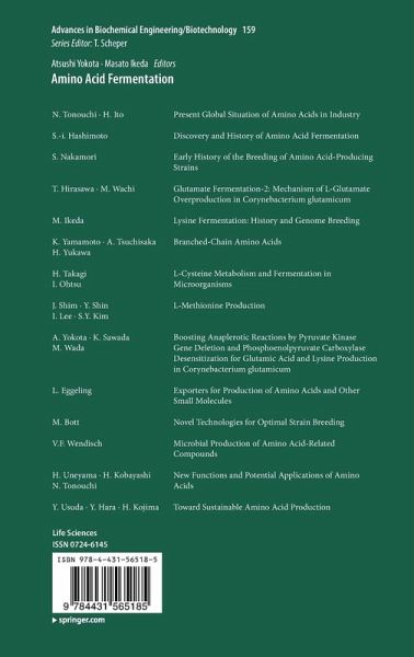 Part I. Situation and history of amino acid fermentation.- Present global situation of amino acids in industry.- Discovery and History of Amino Acid Fermentation.- Early history of the breeding of amino acid-producing strains.- Part II. Examples of amino acids fermentation.- Glutamate fermentation-2: Mechanism of L-glutamate overproduction in Corynebacterium glutamicum.- Lysine Fermentation - History and Genome Breeding.- Branched-chain amino acids.- L-Cysteine metabolism and fermentation in microorganisms.- L-Methionine Production.- Part III. Recent Advances in amino acid fermentation research.- Boosting anaplerotic reactions by pyruvate kinase gene deletion and phosphoenolpyruvate carboxylase desensitization for glutamic acid and lysine production in Corynebacterium glutamicum.- Exporters for production of amino acids and other small molecules.- Novel technologies for optimal strain breeding.- Microbial production of amino acid-related compounds.- Part IV. Future prospective of amino acid fermentation.- New functions and potential applications of amino acids.- Toward sustainable amino acid production.