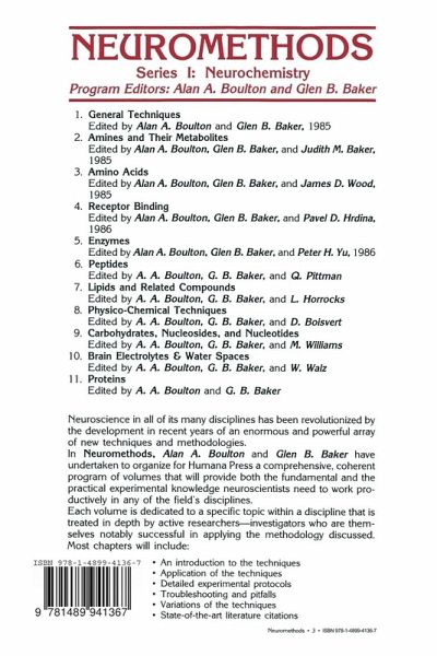 Techniques in the neurosciences are evolving rapidly. There are currently very few volumes dedicated to the methodology - ployed by neurosclentlsts, and those that are available often seem either out of date or limited m scope. This series is about the methods most widely used by modern-day neurosclentists and 1s wrltten by their colleagues who are practicing experts. Volume 1 will be useful to all neurosclentists since It concerns those procedures used routinely across the widest range of subdisciplines. Collecting these general techniques together m a single volume strikes us not only as a service, but will no doubt prove of exceptIona utilitarian value as well. Volumes 2 and 3 - scribe all current procedures for the analyses of amines and their metabolltes and of ammo aads, respectively. These collections will clearly be of value to all neuroscientlsts working m or contemplating research m these fields. Similar reasons exist for Volume 4 on receptor binding techniques since experimental - tails are provided for all types of llgand-receptor bmdmg, including chapters on general prmciples, drug discovery and - velopment, and a most useful appendix on computer programs for Scatchard, nonlinear, and competitive displacement analyses. Volume 5 provides procedures for the assessment of enzymes - volved m biogenic amme synthesis and catabolism. Volumes in the NELJROMETHODS series will be useful to neurochemists, -pharmacologists, -physiologists, -anatomlsts, psychopharmacologists, psychlatnsts, neurologists, and chemists (organic, analytical, pharmaceutical, medicinal), in fact, everyone involved m the neurosclences, both basic and clinical.
