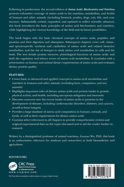 Following its predecessor, the second edition of Amino Acids: Biochemistry and Nutrition presents exhaustive coverage of amino acids in the nutrition, metabolism and health of humans and other animals. Substantially revised, expanded and updated to reflect scientific advances, this book introduces the basic principles of amino acid biochemistry and nutrition, while highlighting the current knowledge of the field and its future possibilities. The book begins with the basic chemical concepts of amnio acids, peptides and proteins, and their digestion and absorption. Subsequent chapters cover cell-, tissue-, and species-specific synthesis and catabolism of amino acids and related bioactive metabolites, and the use of isotopes to study amino acids metabolism in cells and the body. The book details protein turnover, physiological functions of amino acids, as well as both the regulation and inborn errors of amino acid metabolism. The book concludes with a presentation on human and animal dietary requirements of amino acids and evaluates dietary protein quality. Features: Encompasses a comprehensive coverage of basic to applied concepts in amino acid metabolism in humans and other animals. Highlights important roles of dietary amino acids and protein intake in growth, physical performance and health, including sarcopenia mitigation and immunity. Discusses concerns over the excess intakes of amino acids or protein in the development of diseases, including cardiovascular disorders, diabetes and cancers, as well as bone integrity Each chapter contains select references to provide comprehensive reviews and original experimental data on the topics discussed. Each chapter is backed by original experimental data on various topics discussed and contains select references to aid the reader further in research. Written by Distinguished Professor of Animal Nutrition, Guoyao Wu, Ph.D., this book is an authoritative reference for students and researchers in both biomedicine and agriculture.