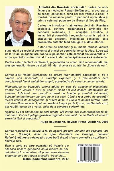 UPDATE: Aceasta este editia 2020 revizuita si adaugita cu documente CNSAS desecretizate. Cartea a avut parte de reactii entuziaste, devenind cel mai vandut e-book in romana pe Amazon; a aparut si pe AmintiridinRomania.com, iTunes, Google Books/Play, bit.ly/e-carti, etc Povestirea ne reintroduce in atmosfera vietii din Romania socialista, scriitorul depanandu-si amintirile din perioada razboiului, ocupatia sovietica, instaurarea si consolidarea regimului comunist, pana la prabusirea dictaturii. Evenimentele istorice si personale se contopesc in valtoarea vietii, aruncandu-l pe autor in cele mai neasteptate situatii. Un rezumat istoric completeaza fiecare capitol. Lectura este recomandata celor care au trait „Epoca de Aur", dar si mai mult generatiilor de dupa '89. Recenzii: Cartea d-lui Rafael-Stefanescu se citeste lejer, datorita capacitatii ei de a captiva prin sinceritate, a claritatii expunerii si a documentarii care completeaza fluxul amintirilor proprii, apropiind-o de ceeace numim istorie. Pigmentarea cu bancurile vremii aduce un plus de atractie si plasticitate. Cand am citit despre intamplarile din vremea razboiului, am reauzit explozii de bombe si zuruitul avioanelor, bubuitul antiaerienelor, pe care nu le-am uitat. Cand a fost vorba de deportari mi-am amintit de cunostintele si rudele duse in Rusia la munca fortata, unde unii si-au lasat oasele. Apoi, am revazut lungul sir de lipsuri, nesfarsitele cozi, am retrait teama de a vorbi, chiar de a concepe scrisori. Asadar, eu am citit cartea pe nerasuflate. Ma intreb insa cum reactioneaza cei mai tineri. Pot ei intelege grozavia regimului comunist? - H. Hauptmann, Revista presei Aradene Cartea reprezinta o lectura la fel de usoara precum „Amintiri din copilarie" ale lui Ion Creanga, doar ca spre deosebire de Creanga, doctorul Rafael-Stefanescu relateaza o adevarata drama si nu o comedie a copilariei si tineretii sale. Este o carte pe care consider ca trebuie s-o citeasca fiecare generatie noua inainte ca noi, cei nascuti in comunism, sa putem avea de la ea pretentia de a nu repeta greselile trecutului. - Malin, PodulMinciunilor.ro Cine a trait timpurile acelea intelege perfect cartea; se citeste usor, o recomand tuturor celor care au uitat de unde au plecat. Cinci stele! - Renate von Bohn Multumesc pentru aceasta carte bine scrisa, evocatoare de evenimente si trairi autentice. Pentru mine, care fac parte din generatia Dv, a fost o delectare sa constat ca felul meu de a gandi si actiona gaseste o confirmare in cartea Dv. Felicitari! - A. MILLEA, fost profesor universitar Excelenta carte! Dupa citirea primelor cateva capitole, realizez ca am descoperit o comoara istorica! Cu toate ca descrie evenimente incepand cu anii 1944, eu ca cititor nascut in anii 80 descoper ca ma pot asocia cu multe din povestirile acestea! Oriunde ai fi pe pamant, vei iubi cartea aceasta care descrie intr-un mod direct si simplu viata parintilor, bunicilor, si stramosilor nostri. Multumesc scriitorului care a pus aceasta comoara pe iTunes! Please don't forget to post an English version of this amazing book! - Andrei M. Carte necesara si sincera, marturie vesnica pentru cei care cred ca socialismul sau comunismul ca si structura sociala poate fi o alternativa viabila. - Varolomei Din condeiul aceluiasi autor: „SAPTE DECENII DE MEDICINA: Amintirile unui medic geriatru/in exil" bit.ly/autor-amz, bit.ly/e-carti, AmintiriDinRomania.com