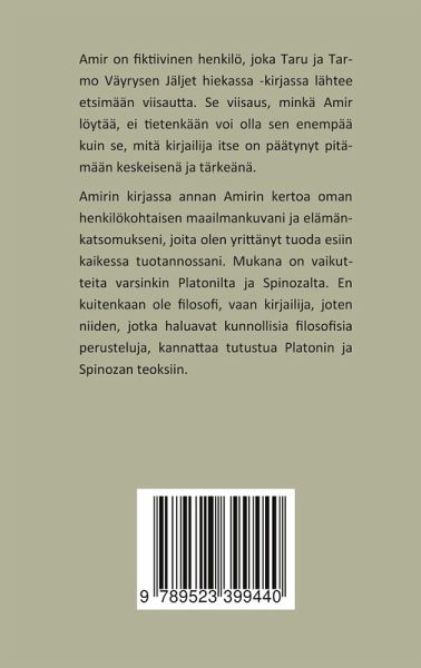 Amir on fiktiivinen henkilö, joka Taru ja Tarmo Väyrysen Jäljet hiekassa -kirjassa lähtee etsimään viisautta. Se viisaus, minkä Amir löytää, ei tietenkään voi olla sen enempää kuin se, mitä kirjailija itse on päätynyt pitämään keskeisenä ja tärkeänä. Amirin kirjassa kerron oman henkilökohtaisen maailmankuvani ja elämänkatsomukseni, joita olen yrittänyt tuoda esiin kaikessa tuotannossani. Mukana on vaikutteita varsinkin Platonilta ja Spinozalta. En kuitenkaan ole filosofi, vaan kirjailija, joten niiden, jotka haluavat kunnollisia filosofisia perusteluja, kannattaa tutustua Platonin ja Spinozan teoksiin.