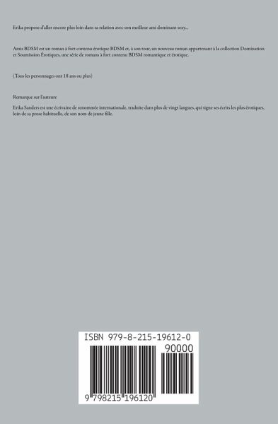 Erika propose d'aller encore plus loin dans sa relation avec son meilleur ami dominant sexy... Amis BDSM est un roman à fort contenu érotique BDSM et, à son tour, un nouveau roman appartenant à la collection Domination et Soumission Érotiques, une série de romans à fort contenu BDSM romantique et érotique. (Tous les personnages ont 18 ans ou plus) Remarque sur l'auteure Erika Sanders est une écrivaine de renommée internationale, traduite dans plus de vingt langues, qui signe ses écrits les plus érotiques, loin de sa prose habituelle, de son nom de jeune fille.