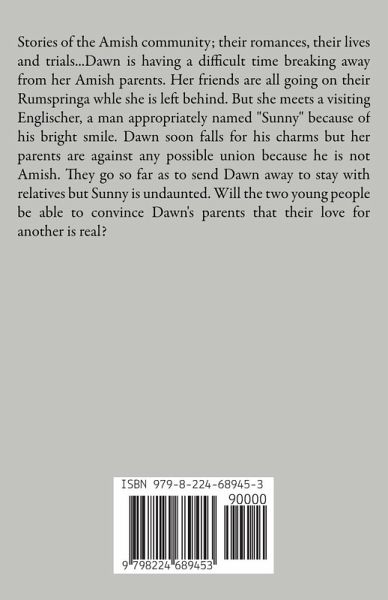Stories of the Amish community; their romances, their lives and trials...Dawn is having a difficult time breaking away from her Amish parents. Her friends are all going on their Rumspringa whle she is left behind. But she meets a visiting Englischer, a man appropriately named "Sunny" because of his bright smile. Dawn soon falls for his charms but her parents are against any possible union because he is not Amish. They go so far as to send Dawn away to stay with relatives but Sunny is undaunted. Will the two young people be able to convince Dawn's parents that their love for another is real?