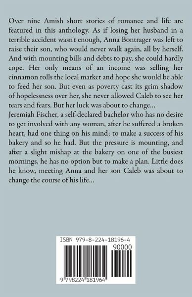 Over nine Amish short stories of romance and life are featured in this anthology. As if losing her husband in a terrible accident wasn't enough, Anna Bontrager was left to raise their son, who would never walk again, all by herself. And with mounting bills and debts to pay, she could hardly cope. Her only means of an income was selling her cinnamon rolls the local market and hope she would be able to feed her son. But even as poverty cast its grim shadow of hopelessness over her, she never allowed Caleb to see her tears and fears. But her luck was about to change... Jeremiah Fischer, a self-declared bachelor who has no desire to get involved with any woman, after he suffered a broken heart, had one thing on his mind; to make a success of his bakery and so he had. But the pressure is mounting, and after a slight mishap at the bakery on one of the busiest mornings, he has no option but to make a plan. Little does he know, meeting Anna and her son Caleb was about to change the course of his life...