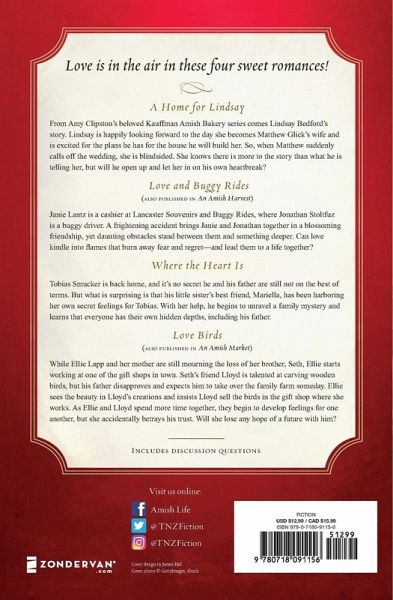Love is in the air in these four sweet romances! Love and Buggy Rides (previously published in An Amish Harvest) Janie Lantz is a cashier at Lancaster Souvenirs and Buggy Rides, where Jonathan Stoltfuz is a buggy driver. A frightening accident brings Janie and Jonathan together in a blossoming friendship, yet daunting obstacles stand between them and something deeper. Can love kindle into flames that burn away fear and regret--and lead them to a life together? A Home for Lindsay From Amy Clipston's beloved Kauffman Amish Bakery series comes Lindsay Bedford's story. Lindsay is happily looking forward to the day she becomes Matthew Glick's wife and is excited for the plans he has for the house he will build her. So, when Matthew suddenly calls off the wedding, she is blindsided. She knows there is more to the story than what he is telling her, but will he open up and let her in on his own heartbreak? Where the Heart Is Tobias Smucker is back home, and it's no secret he and his father are still not on the best of terms. But what is surprising is that his little sister's best friend, Mariella, has been harboring her own secret feelings for Tobias. With her help, he begins to unravel a family mystery and learns that everyone has their own hidden depths, including his father. Love Birds (previously published in An Amish Market) While Ellie Lapp and her mother are still mourning the loss of her brother, Seth, Ellie starts working at one of the gift shops in town. Seth's friend Lloyd is talented at carving wooden birds, but his father disapproves and expects him to take over the family farm someday. Ellie sees the beauty in Lloyd's creations and insists Lloyd sell the birds in the gift shop where she works. As Ellie and Lloyd spend more time together, they begin to develop feelings for one another, but she accidentally betrays his trust. Will she lose any hope of a future with him?