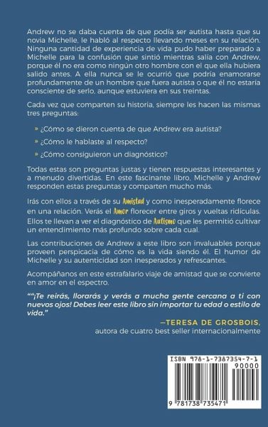 Andrew no se daba cuenta de que podía ser autista hasta que su novia Michelle, le habló al respecto llevando meses en su relación. Ninguna cantidad de experiencia de vida pudo haber preparado a Michelle para la confusión que sintió mientras salía con Andrew, porque él no era como ningún otro hombre con el que ella hubiera salido antes. A ella nunca se le ocurrió que podría enamorarse profundamente de un hombre que fuera autista o que él no estaría consciente de serlo, aunque estuviera en sus treintas. Cada vez que comparten su historia, siempre les hacen las mismas tres preguntas: ¿Cómo se dieron cuenta de que Andrew era autista? ¿Cómo le hablaste al respecto? ¿Cómo consiguieron un diagnóstico? Todas estas son preguntas justas y tienen respuestas interesantes y a menudo divertidas. En este fascinante libro, Michelle y Andrew responden estas preguntas y comparten mucho más. Irás con ellos a través de su Amistad y como inesperadamente florece en una relación. Verás el Amor florecer entre giros y vueltas ridículas. Ellos te llevan a ver el diagnóstico de Autismo que les permitió cultivar un entendimiento más profundo sobre cada cual. Las contribuciones de Andrew a este libro son invaluables porque proveen perspicacia de cómo es la vida siendo él. El humor de Michelle y su autenticidad son inesperados y refrescantes. Acompáñanos en este estrafalario viaje de amistad que se convierte en amor en el espectro. "¡Te reirás, llorarás y verás a mucha gente cercana a ti con nuevos ojos! Debes leer este libro sin importar tu edad o estilo de vida." ¿ Teresa de Grosbois, autora de cuatro best seller internacionalmente