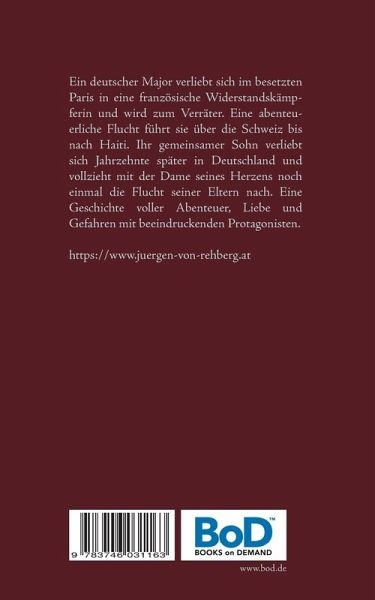 Ein deutscher Major verliebt sich im besetzten Paris in eine französische Widerstandskämpferin und wird zum Verräter. Eine abenteuerliche Flucht führt sie über die Schweiz bis nach Haiti. Ihr gemeinsamer Sohn verliebt sich Jahrzehnte später in Deutschland und vollzieht mit der Dame seines Herzens noch einmal die Flucht seiner Eltern nach. Eine Geschichte voller Abenteuer, Liebe und Gefahren mit beeindruckenden Protagonisten. https://www.juergen-von-rehberg.at