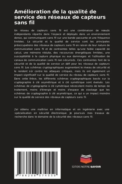 Un réseau de capteurs sans fil est une combinaison de noeuds indépendants répartis dans l'espace et déployés dans un environnement dense, qui communiquent sans fil sur une bande passante et une fréquence limitées. La sécurité et la qualité de service sont les principales préoccupations des réseaux de capteurs sans fil en raison de leur nature de communication sans fil et de contraintes telles qu'une faible capacité de calcul, une mémoire réduite, des ressources énergétiques limitées, une susceptibilité à la capture physique ou aux dommages et l'utilisation de canaux de communication sans fil non sécurisés. Ces contraintes font de la sécurité et de la qualité de service un défi pour les réseaux de capteurs sans fil. Les schémas cryptographiques augmentent le niveau de sécurité et le rendent sûr contre les attaques critiques, mais ils ont également un impact significatif sur la qualité de service du réseau de capteurs sans fil. Dans cette thèse, les différents schémas cryptographiques basés sur la cryptographie à clé asymétrique et à clé symétrique sont évalués. Les schémas de cryptographie à clé symétrique nécessitent moins de temps de traitement, moins d'énergie et moins d'espace de stockage que les schémas de cryptographie à clé asymétrique, ce qui a un impact moindre sur la qualité de service des réseaux de capteurs sans fil.