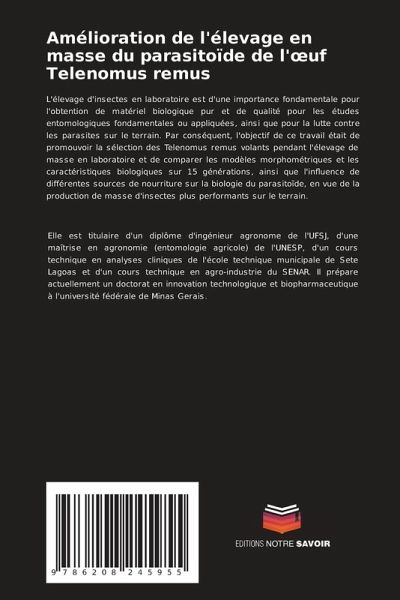 L'élevage d'insectes en laboratoire est d'une importance fondamentale pour l'obtention de matériel biologique pur et de qualité pour les études entomologiques fondamentales ou appliquées, ainsi que pour la lutte contre les parasites sur le terrain. Par conséquent, l'objectif de ce travail était de promouvoir la sélection des Telenomus remus volants pendant l'élevage de masse en laboratoire et de comparer les modèles morphométriques et les caractéristiques biologiques sur 15 générations, ainsi que l'influence de différentes sources de nourriture sur la biologie du parasitoïde, en vue de la production de masse d'insectes plus performants sur le terrain.