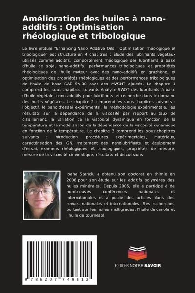 Le livre intitulé "Enhancing Nano Additive Oils : Optimisation rhéologique et tribologique" est structuré en 4 chapitres : Étude des lubrifiants végétaux utilisés comme additifs, comportement rhéologique des lubrifiants à base d'huile de soja, nano-additifs, performances tribologiques et propriétés rhéologiques de l'huile moteur avec des nano-additifs en graphène, et optimisation des propriétés rhéologiques et des performances tribologiques de l'huile de base SAE 5w-30 avec des MWCNT ajoutés. Le chapitre 1 comprend les sous-chapitres suivants Analyse SWOT des lubrifiants à base d'huile végétale, nano-additifs pour lubrifiants, et recherche dans le domaine des huiles végétales. Le chapitre 2 comprend les sous-chapitres suivants : l'objectif, le banc d'essai expérimental, la méthodologie expérimentale, les résultats sur la dépendance de la viscosité par rapport au taux de cisaillement, la variation de la viscosité dynamique en fonction de la température et la modélisation de la dépendance de la viscosité dynamique en fonction de la température. Le chapitre 3 comprend les sous-chapitres suivants : introduction, procédures expérimentales, matériaux, caractérisation des GN, traitement des nanolubrifiants et équipement d'essai, examens rhéologiques et tribologiques, propriétés de mesure, mesure de la viscosité cinématique, résultats et discussions.