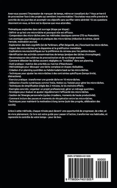 Avez-vous souvent l'impression de manquer de temps, même en travaillant dur ? Vous arrive-t-il de procrastiner face à des projets qui semblent insurmontables ? Souhaitez-vous enfin prendre le contrôle de vos journées et accomplir vos objectifs sans sacrifier votre sérénité ? Si ces questions résonnent en vous, ce livre est la réponse que vous attendiez. Thématiques explorées dans cet ouvrage (étape par étape): - Définir ce qu'est une micro-tâche et pourquoi elle est efficace. - Comparaison des micro-tâches avec les méthodes classiques comme GTD ou Pomodoro. - Les avantages psychologiques et pratiques des micro-tâches (réduction du stress, clarté mentale, motivation accrue). - Exploration des biais cognitifs (loi de Parkinson, effet Zeigarnik, etc.) favorisant les micro-tâches. - Impact des micro-tâches sur la dopamine et la gratification immédiate. - Explications neuroscientifiques sur la préférence du cerveau pour les petites étapes. - Identification des activités consommatrices de temps (analyse des tâches chronophages). - Reconnaissance des schémas de procrastination et de surcharge mentale. - Comment détecter les tâches souvent négligées ou "invisibles" dans son planning. - Outil pratique: matrice des priorités ou matrice d'Eisenhower. - Méthodologie pour découper une tâche complexe en étapes réalisables. - Création d'un planning quotidien ou hebdomadaire basé sur les micro-tâches. - Techniques pour ajuster les micro-tâches à des contraintes spécifiques (temps limité, distractions). - Exercice pratique: transformer une grande tâche en 10 micro-tâches. - Utilisation d'outils numériques comme Trello, Notion ou Todoist pour gérer les micro-tâches. - Techniques de simplification (règle des 2 minutes, loi du moindre effort). - Exemples concrets: organiser un projet professionnel, gérer un ménage quotidien. - Stratégies pour évaluer et ajuster régulièrement l'efficacité des micro-tâches. - Gestion de l'énergie personnelle (cycles circadiens, moments de haute productivité). - Comment inclure des pauses et moments de récupération entre les micro-tâches. >Grâce à cette méthode, chaque minute peut devenir une opportunité de progresser, de créer, et de vivre pleinement. Ce livre est votre guide pour passer à l'action, transformer vos habitudes, et reprendre le contrôle de votre temps - pour de bon.
