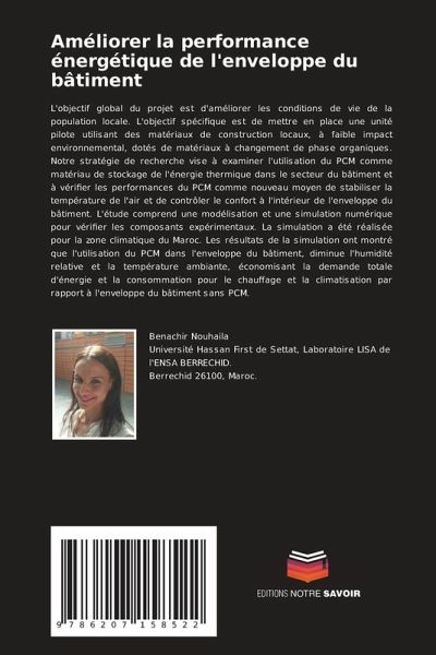 L'objectif global du projet est d'améliorer les conditions de vie de la population locale. L'objectif spécifique est de mettre en place une unité pilote utilisant des matériaux de construction locaux, à faible impact environnemental, dotés de matériaux à changement de phase organiques. Notre stratégie de recherche vise à examiner l'utilisation du PCM comme matériau de stockage de l'énergie thermique dans le secteur du bâtiment et à vérifier les performances du PCM comme nouveau moyen de stabiliser la température de l'air et de contrôler le confort à l'intérieur de l'enveloppe du bâtiment. L'étude comprend une modélisation et une simulation numérique pour vérifier les composants expérimentaux. La simulation a été réalisée pour la zone climatique du Maroc. Les résultats de la simulation ont montré que l'utilisation du PCM dans l'enveloppe du bâtiment, diminue l'humidité relative et la température ambiante, économisant la demande totale d'énergie et la consommation pour le chauffage et la climatisation par rapport à l'enveloppe du bâtiment sans PCM.