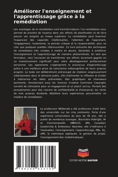 Les avantages de la remédiation sont transformateurs ! La remédiation vous permet de prendre de l'avance dans vos efforts de planification et de faire passer vos progrès au niveau supérieur. La remédiation peut favoriser l'expansion des capacités intellectuelles, l'attention de l'apprenant, l'engagement, l'autonomie, la pensée critique et la responsabilité, pour ne citer que quelques qualités intéressantes. Ce livre présente des techniques de remédiation très simples à mettre en oeuvre, destinées à améliorer l'enseignement et l'apprentissage de manière phénoménale. En tant que formateur, voici l'occasion de transformer vos efforts durement gagnés en un investissement significatif pour votre développement professionnel personnel. Les apprenants s'approprient le processus d'apprentissage grâce à une meilleure prise de conscience métacognitive de leurs propres progrès. Le texte est délibérément entrecoupé de citations soigneusement sélectionnées dans le domaine public, afin d'alimenter la réflexion et d'aider à intérioriser les idées présentées. Des graphiques de shareware pertinents, fonctionnant sous les licences Creative Commons Copyright, servent de stimulants pour un engagement et un plaisir accrus. Portant des pseudonymes pour des raisons de confidentialité et d'anonymat, les récits de mes propres étudiants détaillent leurs expériences personnelles en matière de remédiation.