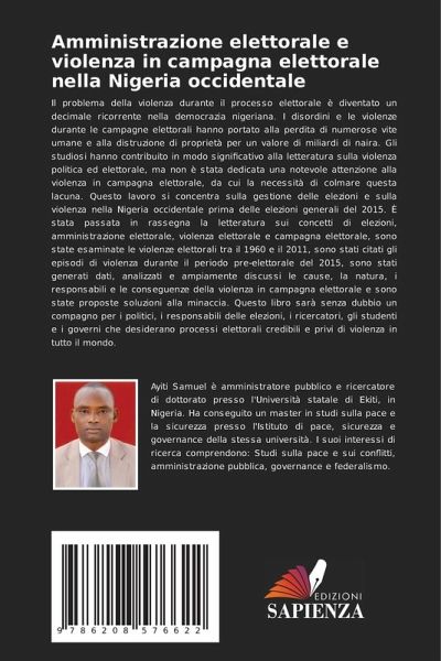 Il problema della violenza durante il processo elettorale è diventato un decimale ricorrente nella democrazia nigeriana. I disordini e le violenze durante le campagne elettorali hanno portato alla perdita di numerose vite umane e alla distruzione di proprietà per un valore di miliardi di naira. Gli studiosi hanno contribuito in modo significativo alla letteratura sulla violenza politica ed elettorale, ma non è stata dedicata una notevole attenzione alla violenza in campagna elettorale, da cui la necessità di colmare questa lacuna. Questo lavoro si concentra sulla gestione delle elezioni e sulla violenza nella Nigeria occidentale prima delle elezioni generali del 2015. È stata passata in rassegna la letteratura sui concetti di elezioni, amministrazione elettorale, violenza elettorale e campagna elettorale, sono state esaminate le violenze elettorali tra il 1960 e il 2011, sono stati citati gli episodi di violenza durante il periodo pre-elettorale del 2015, sono stati generati dati, analizzati e ampiamente discussi le cause, la natura, i responsabili e le conseguenze della violenza in campagna elettorale e sono state proposte soluzioni alla minaccia. Questo libro sarà senza dubbio un compagno per i politici, i responsabili delle elezioni, i ricercatori, gli studenti e i governi che desiderano processi elettorali credibili e privi di violenza in tutto il mondo.