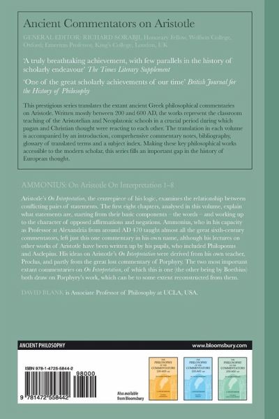 Aristotle's On Interpretation, the centrepiece of his logic, examines the relationship between conflicting pairs of statements. The first eight chapters, analysed in this volume, explain what statements are, starting from their basic components - the words - and working up to the character of opposed affirmations and negations. Ammonius, who in his capacity as Professor at Alexandria from around AD 470 taught almost all the great sixth-century commentators, left just this one commentary in his own name, although his lectures on other works of Aristotle have been written up by his pupils, who included Philoponus and Asclepius. His ideas on Aristotle's On Interpretation were derived from his own teacher, Proclus, and partly from the great lost commentary of Porphyry. The two most important extant commentaries on On Interpretation, of which this is one (the other being by Boethius) both draw on Porphyry's work, which can be to some extent reconstructed for them