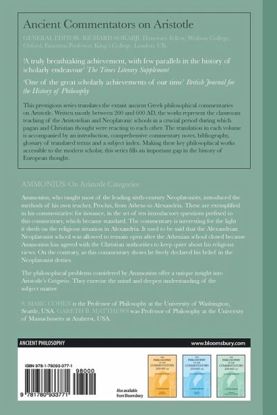 Ammonius, who taught most of the leading sixth-century Neoplatonists, introduced the methods of his own teacher, Proclus, from Athens to Alexandria. These are exemplified in his commentaries: for instance, in the set of ten introductory questions prefixed to this commentary, which became standard. The commentary is interesting for the light it sheds on the religious situation in Alexandria. It used to be said that the Alexandrian Neoplatonist school was allowed to remain open after the Athenian school closed because Ammonius has agreed with the Christian authorities to keep quiet about his religious views. On the contrary, as this commentary shows he freely declared his belief in the Neoplatonist deities. The philosophical problems considered by Ammonius offer a unique insight into Aristotle's Categories. They exercise the mind and deepen understanding of the subject matter. Modern readers would do well to put the same questions to themselves.