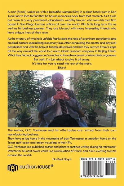 A man (Frank) wakes up with a beautiful woman (Kim) in a plush hotel room in San Juan Puerto Rico to find that he has no memories back from that moment. As it turns out Frank is a very prominent, abundantly wealthy lawyer who owns his own firm based in San Diego but has offices all over the world. Kim is his long term life as well as his business partner. They are blessed with many interesting friends who have unique lives of their own. As the mystery of who he is unfolds Frank seeks the help of prominent psychiatrist and medical doctors specializing in memory loss. After exhausting the mental and physical possibilities and with the help of friends, detectives and Kim they retrace Frank's steps all the way around the world to a micro bionic research company in Beijing China. What they find out boggles one's mind as to the advancement of micro biotic organisms. But wait; I'm just about to give it all away. It's time for you to read the rest of the story. Enjoy!
