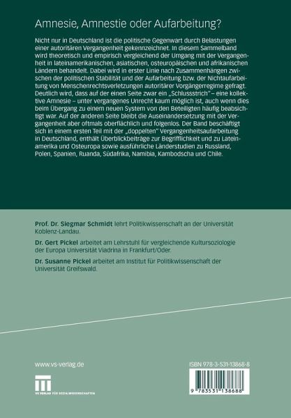 Nicht nur in Deutschland ist die politische Gegenwart durch Belastungen einer autoritären Vergangenheit gekennzeichnet. In diesem Sammelband wird theoretisch und empirisch vergleichend der Umgang mit der Vergangenheit in lateinamerikanischen, asiatischen, osteuropäischen und afrikanischen Ländern behandelt. Dabei wird in erster Linie nach Zusammenhängen zwischen der politischen Stabilität und der Aufarbeitung bzw. der Nichtaufarbeitung von Menschenrechtsverletzungen autoritärer Vorgängerregime gefragt. Deutlich wird, dass auf der einen Seite zwar ein "Schlussstrich" - eine kollektive Amnesie - unter vergangenes Unrecht kaum möglich ist, auch wenn dies beim Übergang zu einem neuen System von den Beteiligten häufig beabsichtigt war. Auf der anderen Seite bleibt die Auseinandersetzung mit der Vergangenheit aber oftmals oberflächlich und folgenlos. Der Band beschäftigt sich in einem ersten Teil mit der "doppelten" Vergangenheitsaufarbeitung in Deutschland, enthält Überblickbeiträge zur Begrifflichkeit und zu Lateinamerika und Osteuropa sowie ausführliche Länderstudien zu Russland, Polen, Spanien, Ruanda, Südafrika, Namibia, Kambodscha und Chile.