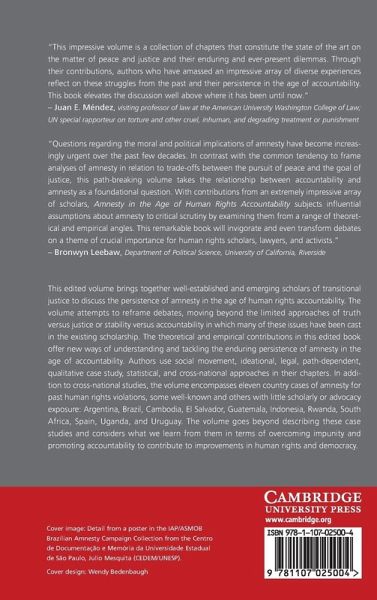 This edited volume brings together well-established and emerging scholars of transitional justice to discuss the persistence of amnesty in the age of human rights accountability. The volume attempts to reframe debates, moving beyond the limited approaches of 'truth versus justice' or 'stability versus accountability' in which many of these issues have been cast in the existing scholarship. The theoretical and empirical contributions in this book offer new ways of understanding and tackling the enduring persistence of amnesty in the age of accountability. In addition to cross-national studies, the volume encompasses eleven country cases of amnesty for past human rights violations: Argentina, Brazil, Cambodia, El Salvador, Guatemala, Indonesia, Rwanda, South Africa, Spain, Uganda and Uruguay. The volume goes beyond merely describing these case studies, but also considers what we learn from them in terms of overcoming impunity and promoting accountability to contribute to improvements in human rights and democracy.