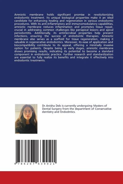 Amniotic membrane holds significant promise in revolutionizing endodontic treatment. Its unique biological properties make it an ideal candidate for enhancing healing and regeneration in various endodontic procedures. With its anti-inflammatory and immunomodulatory capabilities, amniotic membrane reduces inflammation and promotes tissue repair, crucial in addressing common challenges like periapical lesions and apical periodontitis. Additionally, its antimicrobial properties help prevent infections, ensuring the success of endodontic therapies. Amniotic membrane also serves as a scaffold for tissue regeneration, making it valuable in regenerative endodontics. Moreover, its ease of application and biocompatibility contribute to its appeal, offering a minimally invasive option for patients. Despite being in early stages, amniotic membrane shows promising results, indicating its potential to become a standard component in endodontic practice. Further research and standardization are essential to fully realize its benefits and integrate it effectively into endodontic treatments.