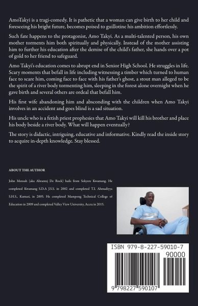 AmoTakyi is a tragi-comedy. It is pathetic that a woman can give birth to her child and foreseeing his bright future, becomes poised to guillotine his ambition effortlessly. Such fate happens to the protagonist, Amo Takyi. As a multi-talented person, his own mother torments him both spiritually and physically. Instead of the mother assisting him to further his education after the demise of the child's father, she hands over a pot of gold to her friend to safeguard. Amo Takyi's education comes to abrupt end in Senior High School. He struggles in life. Scary moments that befall in life including witnessing a timber which turned to human face to scare him, coming face to face with his father's ghost, a stout man alleged to be the spirit of a river body tormenting him, sleeping in the forest alone overnight when he gave birth and several others are ordeal that befall him. His first wife abandoning him and absconding with the children when Amo Takyi involves in an accident and goes blind is a sad situation. His uncle who is a fetish priest prophesies that Amo Takyi will kill his brother and place his body beside a river body. What will happen eventually? The story is didactic, intriguing, educative and informative. Kindly read the inside story to acquire in-depth knowledge. Stay blessed.