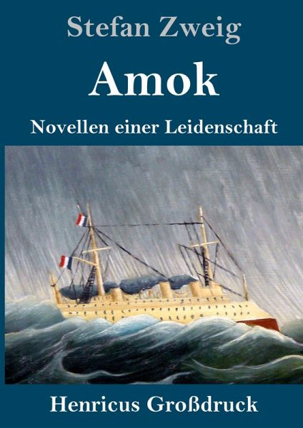 Stefan Zweig: Amok. Novellen einer Leidenschaft Lesefreundlicher Großdruck in 16-pt-Schrift Großformat, 210 x 297 mm Berliner Ausgabe, 2019 Durchgesehener Neusatz bearbeitet und eingerichtet von Theodor Borken Erstdruck: Novellen einer Leidenschaft. Insel, Leipzig 1922. Inhaltsverzeichnis: Amok. Der Amokläufer. Die Frau und die Landschaft. Phantastische Nacht. Brief einer Unbekannten. Die Mondscheingasse. Umschlaggestaltung von Thomas Schultz-Overhage unter Verwendung des Bildes: Henri Rousseau, Dampfer im Sturm, 1899. Gesetzt aus der Minion Pro, 16 pt.