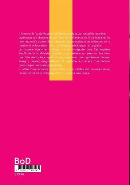 Stefan Zweig, né le 28 novembre 1881 à Vienne et décédé le 22 février 1942 à Petrópolis au Brésil, fut l'un des écrivains autrichiens les plus célèbres et prolifiques de son époque. Issu d'une famille juive aisée, Zweig grandit dans la Vienne cosmopolite et culturellement effervescente de la fin du XIXe siècle, un environnement qui influença profondément son oeuvre. Maître incontesté de la nouvelle psychologique, Zweig excelle dans l'art de l'introspection littéraire. Ses récits, souvent centrés sur des passions dévastatrices et des amours non partagés, révèlent une compréhension aiguë de la complexité de l'âme humaine. Son style élégant et sa capacité à créer une tension narrative intense ont fait de lui l'un des auteurs les plus lus de l'entre-deux-guerres. L'exotisme colonial, présent notamment dans ' Amok ', témoigne de son ouverture sur le monde et de sa fascination pour les cultures étrangères. Zweig était un fervent européen et un pacifiste convaincu, des idéaux qui transparaissent dans son oeuvre et sa vie. Malgré son succès, Zweig fut profondément affecté par la montée du nazisme. Contraint à l'exil en 1934, il vécut en Angleterre, puis aux États-Unis, avant de s'installer au Brésil. C'est là, désespéré par la situation en Europe, qu'il mit fin à ses jours avec sa femme en 1942. L'oeuvre de Zweig, redécouverte ces dernières années, continue de fasciner les lecteurs par sa profondeur psychologique et son humanisme universel.