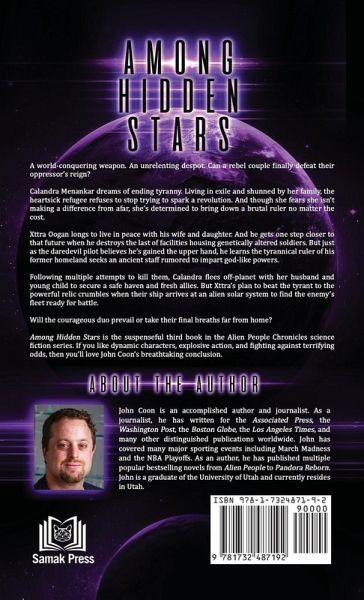 A world-conquering weapon. An unrelenting despot. Can a rebel couple finally defeat their oppressor's reign? Calandra Menankar dreams of ending tyranny. Living in exile and shunned by her family, the heartsick refugee refuses to stop trying to spark a revolution. And though she fears she isn't making a difference from afar, she's determined to bring down a brutal ruler no matter the cost. Xttra Oogan longs to live in peace with his wife and daughter. And he gets one step closer to that future when he destroys the last of facilities housing genetically altered soldiers. But just as the daredevil pilot believes he's gained the upper hand, he learns the tyrannical ruler of his former homeland seeks an ancient staff rumored to impart god-like powers. Following multiple attempts to kill them, Calandra flees off-planet with her husband and young child to secure a safe haven and fresh allies. But Xttra's plan to beat the tyrant to the powerful relic crumbles when their ship arrives at an alien solar system to find the enemy's fleet ready for battle. Will the courageous duo prevail or take their final breaths far from home? Among Hidden Stars is the suspenseful third book in the Alien People Chronicles science fiction series. If you like dynamic characters, explosive action, and fighting against terrifying odds, then you'll love John Coon's breathtaking conclusion.