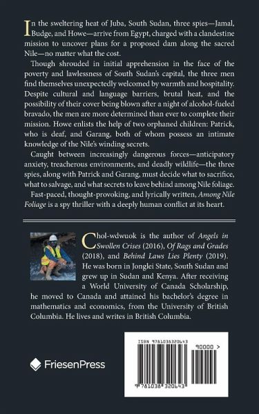 In the sweltering heart of Juba, South Sudan, three spies-Jamal, Budge, and Howe-arrive from Egypt, charged with a clandestine mission to uncover plans for a proposed dam along the sacred Nile-no matter what the cost. Though shrouded in initial apprehension in the face of the poverty and lawlessness of South Sudan's capital, the three men find themselves unexpectedly welcomed by warmth and hospitality. Despite cultural and language barriers, brutal heat, and the possibility of their cover being blown after a night of alcohol-fueled bravado, the men are more determined than ever to complete their mission. Howe enlists the help of two orphaned children: Patrick, who is deaf, and Garang, both of whom possess an intimate knowledge of the Nile's winding secrets. Caught between increasingly dangerous forces-anticipatory anxiety, treacherous environments, and deadly wildlife-the three spies, along with Patrick and Garang, must decide what to sacrifice, what to salvage, and what secrets to leave behind among Nile foliage. Fast-paced, thought-provoking, and lyrically written, Among Nile Foliage is a spy thriller with a deeply human conflict at its heart.