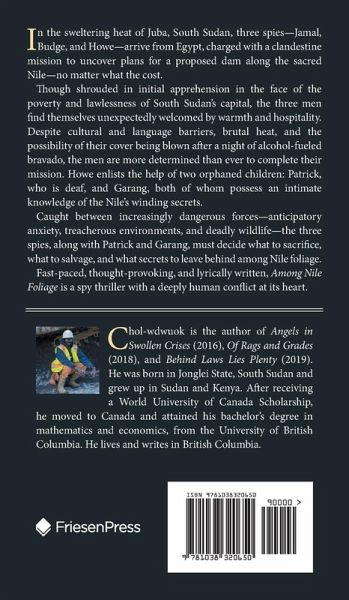 In the sweltering heart of Juba, South Sudan, three spies-Jamal, Budge, and Howe-arrive from Egypt, charged with a clandestine mission to uncover plans for a proposed dam along the sacred Nile-no matter what the cost. Though shrouded in initial apprehension in the face of the poverty and lawlessness of South Sudan's capital, the three men find themselves unexpectedly welcomed by warmth and hospitality. Despite cultural and language barriers, brutal heat, and the possibility of their cover being blown after a night of alcohol-fueled bravado, the men are more determined than ever to complete their mission. Howe enlists the help of two orphaned children: Patrick, who is deaf, and Garang, both of whom possess an intimate knowledge of the Nile's winding secrets. Caught between increasingly dangerous forces-anticipatory anxiety, treacherous environments, and deadly wildlife-the three spies, along with Patrick and Garang, must decide what to sacrifice, what to salvage, and what secrets to leave behind among Nile foliage. Fast-paced, thought-provoking, and lyrically written, Among Nile Foliage is a spy thriller with a deeply human conflict at its heart.