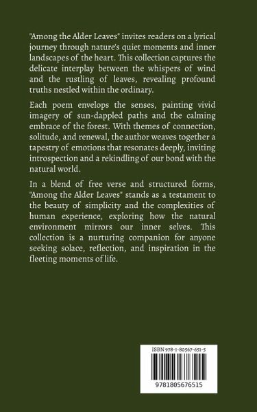 "Among the Alder Leaves" invites readers on a lyrical journey through nature's quiet moments and inner landscapes of the heart. This collection captures the delicate interplay between the whispers of wind and the rustling of leaves, revealing profound truths nestled within the ordinary. Each poem envelops the senses, painting vivid imagery of sun-dappled paths and the calming embrace of the forest. With themes of connection, solitude, and renewal, the author weaves together a tapestry of emotions that resonates deeply, inviting introspection and a rekindling of our bond with the natural world. In a blend of free verse and structured forms, "Among the Alder Leaves" stands as a testament to the beauty of simplicity and the complexities of human experience, exploring how the natural environment mirrors our inner selves. This collection is a nurturing companion for anyone seeking solace, reflection, and inspiration in the fleeting moments of life.
