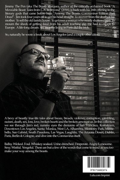 Jimmy The Pen (aka The Beast) Marquez, author of the critically acclaimed collection "A Moveable Beast: Tales from L.A. & Beyond" (LuLu, 2016), is back with his 16th offering to the literary gods that came before him: "Among The Beasts: Coronavirus Edition Part Deux!". Jim took four years off to get his head straight: To recover from the death of his mother. To sell the old family house. To get over a woman who nearly shattered him. To mourn the shock of getting fired from his adult teaching gig. He had to escape to Europe. A life-long dream. Six months living in Paris did the trick. So, naturally he wrote a book about Los Angeles (and a couple other cities). A bevy of beastly true-life tales about booze, women, violence, corruption, gambling, racism, death, sex, loss, love, broken hearts and the broken amongst us. In this collection (his 16th w/LuLu) we see through Jim's red, rummy eyes the denizens of San Francisco, Koreatown, Downtown Los Angeles, Santa Monica, West LA, Alhambra, Monterey Park, Montebello, San Gabriel, East Pasadena, Las Vegas, Laughlin, The Arizona Desert, Dublin, Paris, Berlin & Cologne, and dive into the Coronavirus itself. Wickedly inspired. Foul. Whiskey soaked. Desperate. Angry. Lonesome. Sexy. Wistful. Vengeful. These are but a few of the words that come to mind as you too make your way among the beasts.