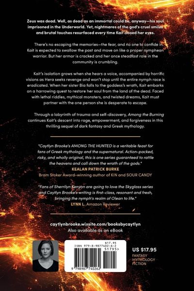 Zeus was dead. Well, as dead as an immortal could be, anyway-his soul imprisoned in the Underworld. Yet, nightmares of the god's cruel smiles and brutal touches resurfaced every time Kait closed her eyes. There's no escaping the memories-the fear, and no one to confide in. Kait is expected to swallow the past and move on like a proper nymphean warrior. But her armor is cracked and her once steadfast role in the community is crumbling. Kait's isolation grows when she hears a voice, accompanied by horrific visions as Hera seeks revenge and won't stop until the entire nymph race is eradicated. When her sister Bia falls to the goddess's wrath, Kait embarks on a harrowing quest to restore her soul from the land of the dead. Faced with lethal riddles, mythical monsters, and twisted dreams, Kait must partner with the one person she is desperate to escape. Through a labyrinth of trauma and self-discovery, Among the Burning continues Kait's descent into rage, empowerment, and forgiveness in this thrilling sequel of dark fantasy and Greek mythology.
