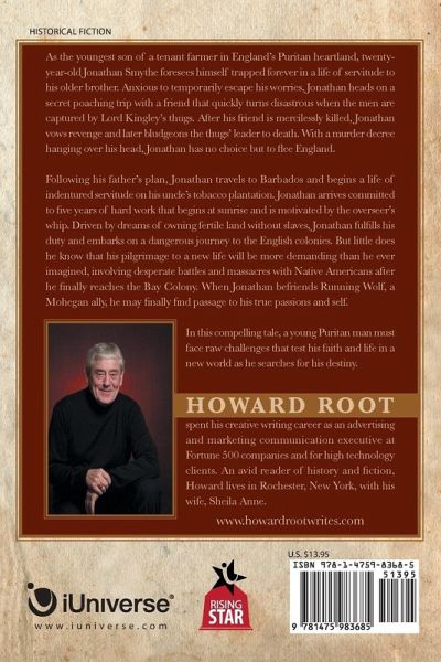 As the youngest son of a tenant farmer in England's Puritan heartland, twenty-year-old Jonathan Smythe foresees himself trapped forever in a life of servitude to his older brother. Anxious to temporarily escape his worries, Jonathan heads on a secret poaching trip with a friend that quickly turns disastrous when the men are captured by Lord Kingley's thugs. After his friend is mercilessly killed, Jonathan vows revenge and later bludgeons the thugs' leader to death. With a murder decree hanging over his head, Jonathan has no choice but to flee England. Following his father's plan, Jonathan travels to Barbados and begins a life of indentured servitude on his uncle's tobacco plantation. Jonathan arrives committed to five years of hard work that begins at sunrise and is motivated by the overseer's whip. Driven by dreams of owning fertile land without slaves, Jonathan fulfills his duty and embarks on a dangerous journey to the English colonies. But little does he know that his pilgrimage to a new life will be more demanding than he ever imagined, involving desperate battles and massacres with Native Americans after he finally reaches the Bay Colony. When Jonathan befriends Running Wolf, a Mohegan ally, he may finally find passage to his true passions and self. In this compelling tale, a young Puritan man must face raw challenges that test his faith and life in a new world as he searches for his destiny.