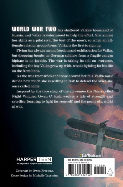 A suspenseful historical YA debut inspired by the true story of an all-female bomber unit in Russia during World War II. World War II has erupted in Valka's homeland of Russia, and Valka is determined to help the effort. She's a pilot--and a good one--so she eagerly joins an all-female bomber regiment. Flying has always meant freedom and exhilaration for Valka, but dropping bombs on German targets is something else entirely. The raids are dangerous, but as Valka watches her fellow pilots putting everything on the line in the face of treachery, she learns the true meaning of bravery. As the war intensifies, though, and those around her fall, Valka must decide how much she is willing to risk to defend the skies she once called home. Inspired by the true story of a famous all-female Russian bomber regiment, Gwen C. Katz weaves a tale of strength and sacrifice, of learning to fight for yourself, and of the perils of a world at war.