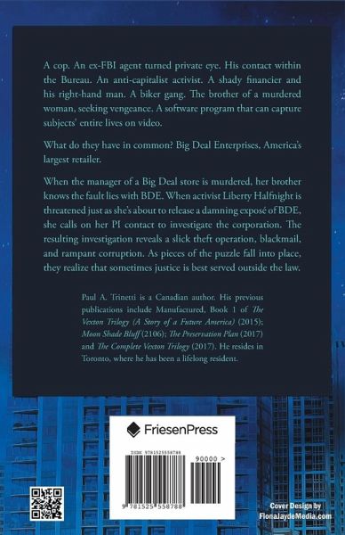 A cop. An ex-FBI agent turned private eye. His contact within the Bureau. An anti-capitalist activist. A shady financier and his right-hand man. A biker gang. The brother of a murdered woman, seeking vengeance. A software program that can capture subjects' entire lives on video. What do they have in common? Big Deal Enterprises, America's largest retailer. When the manager of a Big Deal store is murdered, her brother knows the fault lies with BDE. When activist Liberty Halfnight is threatened just as she's about to release a damning expose¿ of BDE, she calls on her PI contact to investigate the corporation. The resulting investigation reveals a slick theft operation, blackmail, and rampant corruption. As pieces of the puzzle fall into place, they realize that sometimes justice is best served outside the law.
