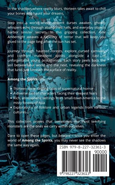 In the shadows where reality blurs, thirteen tales await to chill your bones and haunt your dreams. Step into a world where ancient curses awaken, ghostly whispers echo through abandoned halls, and everyday objects harbor sinister secrets. In this gripping collection, Ashe Ambernight weaves a tapestry of terror that will keep you glued to the page long after the sun has set. Journey through haunted forests, explore cursed carnivals, and confront malevolent spirits alongside a cast of unforgettable young protagonists. Each story peels back the veil between our world and the next, revealing the darkness that lurks just beneath the surface of reality. "Among the Spirits" offers:Thirteen spine-tingling tales of supernatural horror A diverse cast of characters facing their deepest fears Rich, atmospheric settings from small-town America to the misty forests of Asia Explorations of folklore and urban legends from various cultures This collection proves that sometimes the most terrifying monsters are the ones we carry within ourselves. Dare to open these pages, but beware - once you enter the world of "Among the Spirits", you may never see the shadows the same way again.