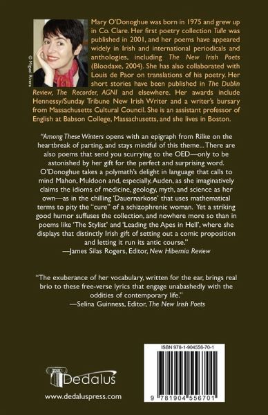 Mary O'Donoghue was born in 1975 and grew up in Co. Clare. Her first poetry collection Tulle was published in 2001, and her poems have appeared widely in Irish and international periodicals and anthologies, including The New Irish Poets (Bloodaxe, 2004). She is an assistant professor of English at Babson College, Massachusetts, and she lives in Boston. Among These Winters opens with an epigraph from Rilke on the heartbreak of parting, and stays mindful of this theme... Yet a striking good humor suffuses the collection, and nowhere more so than in poems like "The Stylist" and "Leading the Apes in Hell," where she displays that distinctly Irish gift of setting out a comic proposition and letting it run its antic course. -James Silas Rogers, Editor, New Hibernia Review