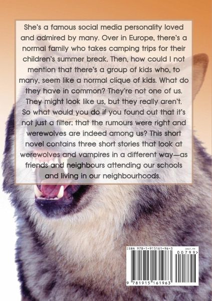 She's a famous social media personality loved and admired by many. Over in Europe, there's a normal family who takes camping trips for their children's summer break. Then, how could I not mention that there's a group of kids who, to many, seem like a normal clique of kids. What do they have in common? They're not one of us. They might look like us, but they really aren't. So what would you do if you found out that it's not just a filter; that the rumours were true and werewolves are indeed Among Us? This short novel contains three short stories that look at werewolves and vampires in a different way-as friends and neighbours attending our schools and living in our neighbourhoods.
