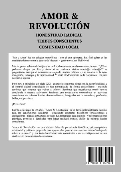 Sientes que las comunidades locales se están desmoronando? ¿Sientes que la Cárcel Digital Global está apretando? ¿Sientes que algun@s tenemos que tejer tejidos sociales alternativos? "AMOR & REVOLUCIÓN: Honestidad Radical, Tribus Conscientes, Comunidad Local" propone un método profundo, radical, simple, gratuito - empezando con grupos de amig@s convirtiéndose en Tribus Conscientes. Podemos empezar a formar culturas alternativas llevando la amistad a otro nivel - al nivel de un viaje "existencial" compartido, un viaje recorrido juntos en profunda intimidad, un viaje con un propósito creativo compartido...