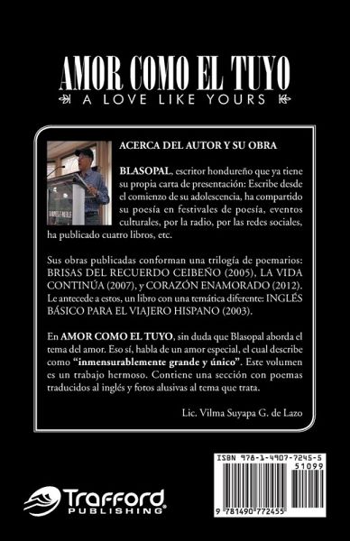 En AMOR COMO EL TUYO, sin duda que Blasopal aborda el tema del amor. Eso sí, habla de un amor especial, el cual describe como "inmensurablemente grande y único". Este volumen es un trabajo hermoso. Contiene una sección con poemas traducidos al inglés y fotos alusivas al tema que trata. Lic. Vilma Suyapa G. de Lazo