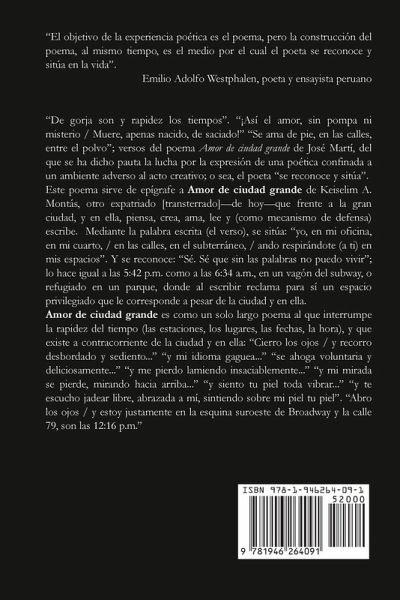 Amor de ciudad grande es como un solo largo poema al que interrumpe la rapidez del tiempo (las estaciones, los lugares, las fechas, la hora), y que existe a contracorriente de la ciudad y en ella: "Cierro los ojos / y recorro desbordado y sediento..." "y mi idioma gaguea..." "se ahoga oluntaria y deliciosamente..." "y me pierdo lamiendo insaciablemente..." "y mi mirada se pierde, mirando hacia arriba..." "y siento tu piel toda ibrar..." "y te escucho jadear libre, abrazada a mí, sintiendo sobre mi piel tu piel". "Abro los ojos / y estoy justamente en la esquina suroeste de Broadway y la calle 79, son las 12:16 p.m."
