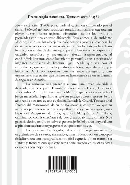 "Amor en la aldea" (1940), presentada al certamen convocado por el diario Voluntad, no supo satisfacer aquellas aspiraciones que querían elevar nuestro teatro regional, distanciándose de las otras dos premiadas con una enorme diferencia. Esta comedia, de ambiente aldeano, es un arrebatado ejercicio de oratoria procesal, como así lo delatan muchos de los términos utilizados. Por lo tanto, es hija de un letrado, con ínfulas de dramaturgo, que escribe con estilo anquiloso y oxidado, ampuloso y pretencioso, siendo irrepresentable, al confundir la literatura con el lucimiento personal, y con la escritura de ingentes cantidades de literatura gris. Nada que ver con el naturalismo, que sustituía la palabra medicina, aquí derecho, por literatura. Aquí nos topamos con un autor recargado y con expresiones mesetarias, que insisten en la existencia de vastas llanuras de trigales en Asturias. La comedia nos presenta a Ana, una joven aburrida e ilustrada, a la que su padre Damián quiere casar con Pedro, el mejor de sus criados. Antes de marcharse a Madrid, aparecerá en su vida el joven madrileño Pepe Luis, al que sus padres quieren apartar de los amores de otra mujer, una cupletista llamada la Churri. Tras asistir al fracaso del matrimonio de su prima Manola, comprobará que su amor no pertenecerá nunca a aquellos zafios y rudos zagales, más hijos del Arcipreste de Hita, que del Marqués de Santillana, culminando con la enseñanza de que el amor siempre triunfa. Nos gustaría decir que sólo se salva el personaje de Felipe, un mayoral con aspiraciones a dramaturgo, pero ni eso podemos salvar. La obra nos ha llegado, tal vez por empecinamiento y engreimiento de su autor, sin matices, transmitiéndonos un concepto de la literatura como antigualla, como fósil expresivo, bien lejano de la fluidez y frescura con que este tema sería tratado en muchas otras ocasiones con mejor fortuna.