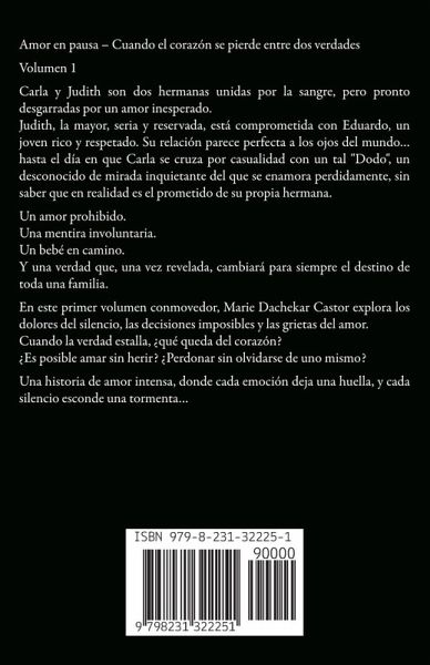 Amor en pausa - Cuando el corazón se pierde entre dos verdades Volumen 1 Carla y Judith son dos hermanas unidas por la sangre, pero pronto desgarradas por un amor inesperado. Judith, la mayor, seria y reservada, está comprometida con Eduardo, un joven rico y respetado. Su relación parece perfecta a los ojos del mundo... hasta el día en que Carla se cruza por casualidad con un tal "Dodo", un desconocido de mirada inquietante del que se enamora perdidamente, sin saber que en realidad es el prometido de su propia hermana. Un amor prohibido. Una mentira involuntaria. Un bebé en camino. Y una verdad que, una vez revelada, cambiará para siempre el destino de toda una familia. En este primer volumen conmovedor, Marie Dachekar Castor explora los dolores del silencio, las decisiones imposibles y las grietas del amor. Cuando la verdad estalla, ¿qué queda del corazón? ¿Es posible amar sin herir? ¿Perdonar sin olvidarse de uno mismo? Una historia de amor intensa, donde cada emoción deja una huella, y cada silencio esconde una tormenta...