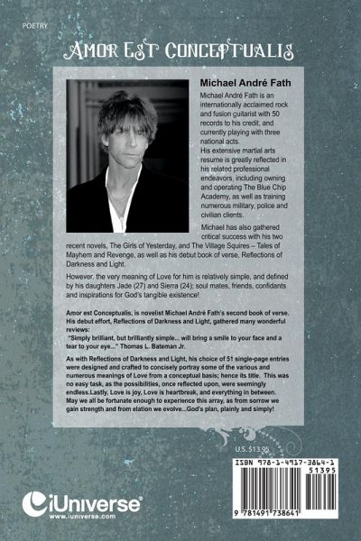 Amor est Conceptualis, is novelist Michael André Fath's second book of verse. His debut effort, Reflections of Darkness and Light, gathered many wonderful reviews: "Simply brilliant, but brilliantly simple... will bring a smile to your face and a tear to your eye..." - Thomas L. Bateman Jr. "His ability to translate a keen power of observation into prose is uncanny..." - J. Gilman "...Michael's sensitive poems reveal genuine pieces of his soul, an inspirational journey from start to finish...Guaranteed to evoke emotions throughout..." - Stacy Carroll "With brilliant execution, Michael André Fath manages to take his readers on a soulful journey of tragedy and despair, spiritual cleansing, and creative inspiration..." - Bonnie Abbott As with Reflections of Darkness and Light, his choice of 51 single-page entries were designed and crafted to concisely portray some of the various and numerous meanings of Love from a conceptual basis; hence its title. This was no easy task, as the possibilities, once reflected upon, were seemingly endless. Lastly, Love is joy, Love is heartbreak, and everything in between. May we all be fortunate enough to experience this array, as from sorrow we gain strength and from elation we evolve...God's plan, plainly and simply!