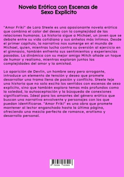 "Amor Friki" de Lara Steele es una apasionante novela erótica que combina el calor del deseo con la complejidad de las relaciones humanas. La historia sigue a Michael, un joven que se debate entre su vida cotidiana y sus anhelos más íntimos. Desde el primer capítulo, la narrativa nos sumerge en el mundo de Michael, quien, mientras lucha contra su aversión al ejercicio en el gimnasio, también enfrenta sus sentimientos y experiencias pasadas. La dinámica con su mejor amigo Mitch añade un toque de humor y realismo, mientras exploran juntos las complejidades del amor y la amistad. La aparición de Devlin, un hombre sexy pero arrogante, introduce un elemento de tensión y deseo que promete desarrollar una trama llena de pasión y conflicto. Steele teje una historia que no solo excita los sentidos con escenas de sexo explícito, sino que también explora temas más profundos como la soledad, la autoaceptación y la búsqueda de conexiones significativas. Ideal para los amantes del género erótico que buscan una narrativa envolvente y personajes con los que puedan identificarse. "Amor Friki" es una obra que promete mantener al lector enganchado hasta la última página, ofreciendo una mezcla perfecta de romance, erotismo y desarrollo personal.
