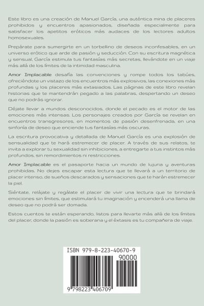 Este libro es una creación de Manuel García, una auténtica mina de placeres prohibidos y encuentros apasionados, diseñada especialmente para satisfacer los apetitos eróticos más audaces de los lectores adultos homosexuales. Prepárate para sumergirte en un torbellino de deseos inconfesables, en un universo erótico que arde de pasión y seducción. Con su escritura magnética y sensual, García estimula tus fantasías más secretas, llevándote en un viaje más allá de los límites de la intimidad masculina. Amor Implacable desafía las convenciones y rompe todos los tabúes, ofreciéndote un vistazo de los encuentros más explosivos, las conexiones más profundas y los placeres más extasiados. Las páginas de este libro revelan historias que te mantendrán pegado a las palabras, despertando un deseo que no podrás ignorar. Déjate llevar a mundos desconocidos, donde el pecado es el motor de las emociones más intensas. Los personajes creados por García se revelan en encuentros transgresores, en momentos de pasión desenfrenada, en una sinfonía de deseo que enciende tus fantasías más oscuras. La escritura provocativa y detallada de Manuel García es una explosión de sensualidad que te hará estremecer de placer. A través de sus relatos, te invita a explorar tu sexualidad sin inhibiciones, a entregarte a tus instintos más profundos, sin remordimientos ni restricciones. Amor Implacable es el pasaporte hacia un mundo de lujuria y aventuras prohibidas. No dejes escapar esta lectura que te llevará a un territorio de placer intenso, de sueños descarados y sensaciones que te harán estremecer la piel. Siéntate, relájate y regálate el placer de vivir una lectura que te brindará emociones sin límites, que estimulará tu imaginación y encenderá una llama de deseo que no podrá ser domada. Estos cuentos te están esperando, listos para llevarte más allá de los límites del placer, donde la pasión es soberana y el éxtasis es tu compañera de viaje.