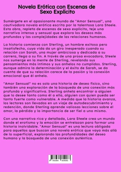 Sumérgete en el apasionante mundo de "Amor Sensual", una cautivadora novela erótica escrita por la talentosa Lara Steele. Esta obra, repleta de escenas de sexo explícito, teje una narrativa intensa y sensual que explora los deseos más profundos y las complejidades de las relaciones humanas.La historia comienza con Sterling, un hombre exitoso pero insatisfecho, cuya vida da un giro inesperado cuando su relación con Sarah, una mujer ambiciosa y dedicada a su carrera, llega a su fin. A través de una prosa evocadora, Steele nos sumerge en la mente de Sterling, revelando sus pensamientos más íntimos y sus anhelos no cumplidos. Sterling, aunque admira la determinación y el éxito de Sarah, se da cuenta de que su relación carece de la pasión y la conexión emocional que él anhela."Amor Sensual" no es solo una historia de deseo físico, sino también una exploración de la búsqueda de una conexión más profunda y significativa. Sterling anhela encontrar a alguien que lo desee tanto como él a ella, alguien con quien pueda ser tanto fuerte como vulnerable. A medida que la historia avanza, los lectores son llevados en un viaje de autodescubrimiento y redención, donde Sterling aprende valiosas lecciones sobre el amor, la pérdida y la importancia de ser fiel a uno mismo.Con una narrativa rica y detallada, Lara Steele crea un mundo donde el erotismo y la emoción se entrelazan para formar una historia inolvidable. "Amor Sensual" es una lectura obligada para aquellos que buscan una novela erótica que vaya más allá de lo superficial, explorando las profundidades del deseo humano y la búsqueda de una conexión auténtica.No te pierdas esta obra maestra de la literatura erótica, perfecta para los amantes del género que buscan una historia llena de pasión, emoción y una narrativa envolvente. "Amor Sensual" promete mantenerte en vilo hasta la última página, dejando una impresión duradera en tu corazón y tu imaginación.