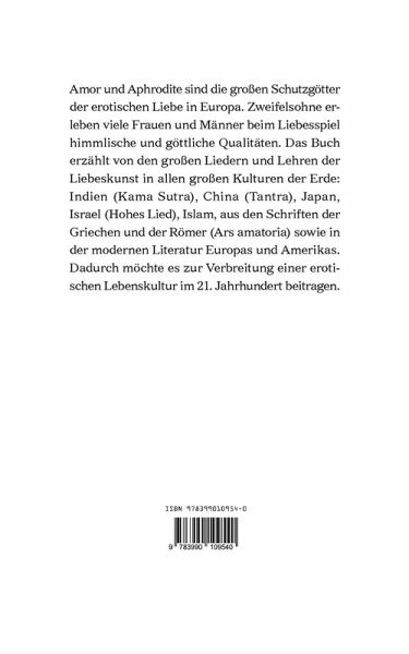 Amor und Aphrodite sind die großen Schutzgötter der erotischen Liebe in Europa. Zweifelsohne erleben viele Frauen und Männer beim Liebesspiel himmlische und göttliche Qualitäten. Das Buch erzählt von den großen Liedern und Lehren der Liebeskunst in allen großen Kulturen der Erde: Indien (Kama Sutra), China (Tantra), Japan, Israel (Hohes Lied), Islam, aus den Schriften der Griechen und der Römer (Ars amatoria) sowie in der modernen Literatur Europas und Amerikas. Dadurch möchte es zur Verbreitung einer erotischen Lebenskultur im 21. Jahrhundert beitragen.