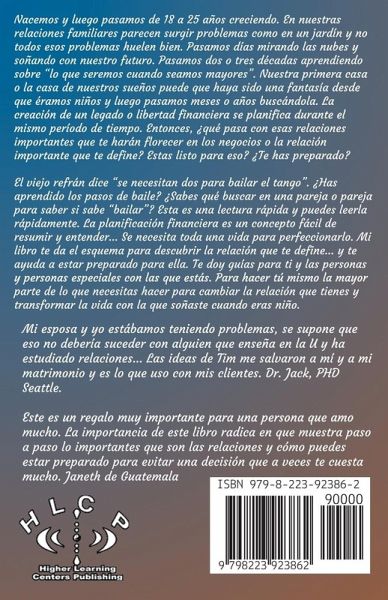 Nacemos y luego pasamos de 18 a 25 años creciendo. En nuestras relaciones familiares parecen surgir problemas como en un jardín y no todos esos problemas huelen bien. Pasamos días mirando las nubes y soñando con nuestro futuro. Pasamos dos o tres décadas aprendiendo sobre "lo que seremos cuando seamos mayores". Nuestra primera casa o la casa de nuestros sueños puede que haya sido una fantasía desde que éramos niños y luego pasamos meses o años buscándola. La creación de un legado o libertad financiera se planifica durante el mismo período de tiempo. Entonces, ¿qué pasa con esas relaciones importantes que te harán florecer en los negocios o la relación importante que te define? Estas listo para eso? ¿Te has preparado? El viejo refrán dice "se necesitan dos para bailar el tango". ¿Has aprendido los pasos de baile? ¿Sabes qué buscar en una pareja o pareja para saber si sabe "bailar"? Esta es una lectura rápida y puedes leerla rápidamente. La planificación financiera es un concepto fácil de resumir y entender... Se necesita toda una vida para perfeccionarlo. Mi libro te da el esquema para descubrir la relación que te define... y te ayuda a estar preparado para ella. Te doy guías para ti y las personas y personas especiales con las que estás. Para hacer tú mismo la mayor parte de lo que necesitas hacer para cambiar la relación que tienes y transformar la vida con la que soñaste cuando eras niño.